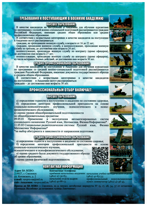 Ищете своё призвание и хотите служить Родине, получая престижное образование? Военная академия войсковой противовоздушной обороны Вооружённых Сил РФ (г. Смоленск) открывает двери для новых курсантов!