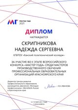 Всего в конкурсе приняли участие 23 преподавателя из 21 учебного заведения, имеющие успешный опыт подготовки обучающихся по стандартам Ворлдскиллс. От нашего колледжа участие во Всероссийском конкурса "Мастер года" приняла мастер производственного обучения - Скрипникова Надежда Сергеевна.