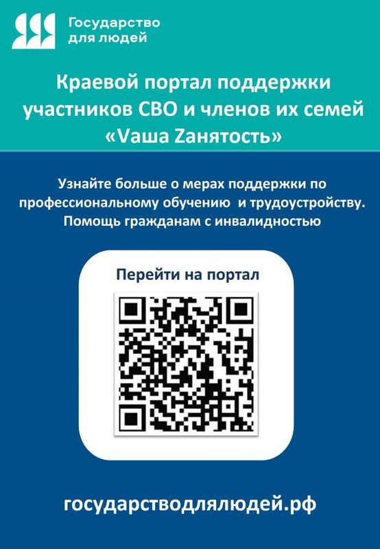 В соответствии подпункта «в» пункта 4.2 протокола заседания Президиума Правительства Красноярского края от 20.10.2025 № 14-зп, организовано межведомственное взаимодействие в целях информирования участников специальной военной операции (далее – СВО) и членов их семей при посещении ими любого государственного учреждения о возможностях получения государственных гарантий в случае возникновения различных жизненных ситуаций на краевом портале поддержки участников СВО и членов их семей «Vаша Zанятость» (https://vz.krskstate.ru/#/)